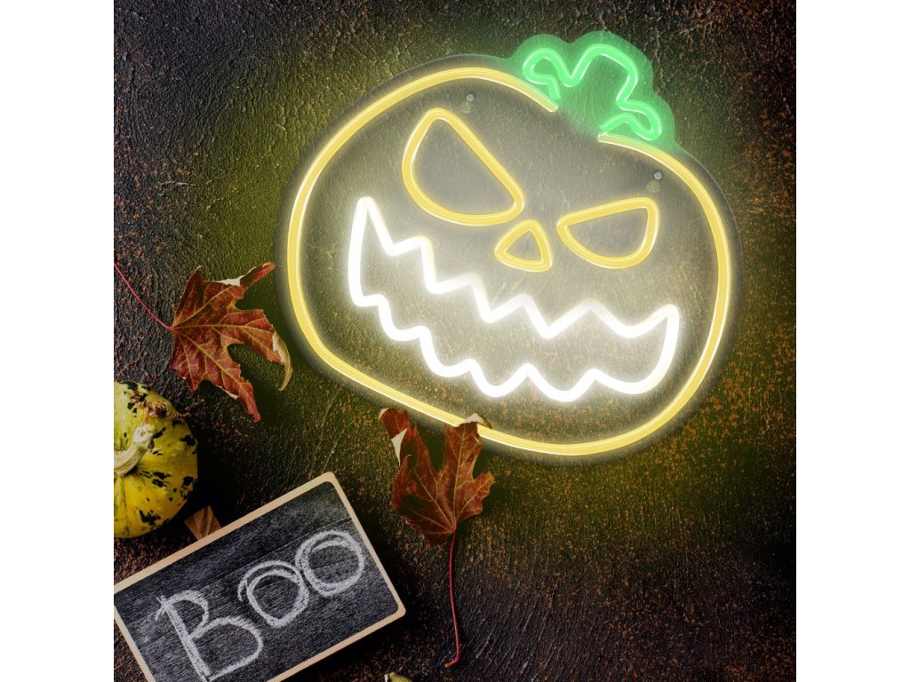 Svetelná silueta Halloween Angry Pumpkin - Tekvica, je vyrobená z LED imitácie neónu, nalepeného na priehľadnom plexiskle. Nádherný rozptyl svetla bez viditeľných svetelných bodov. Vďaka priehľadnému plexisklu je bezpečne chránený a zároveň jednoducho inštalovateľný na stenu pomocou neviditeľných dier. Vďaka technológii postavenej na LED diódach, sú tieto neóny oveľa spoľahlivejšie a navyše oveľa úspornejšie, ako klasické neóny.