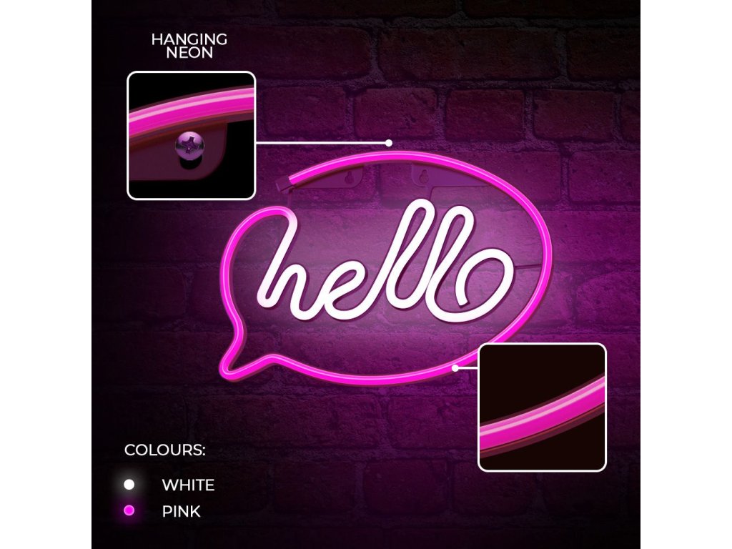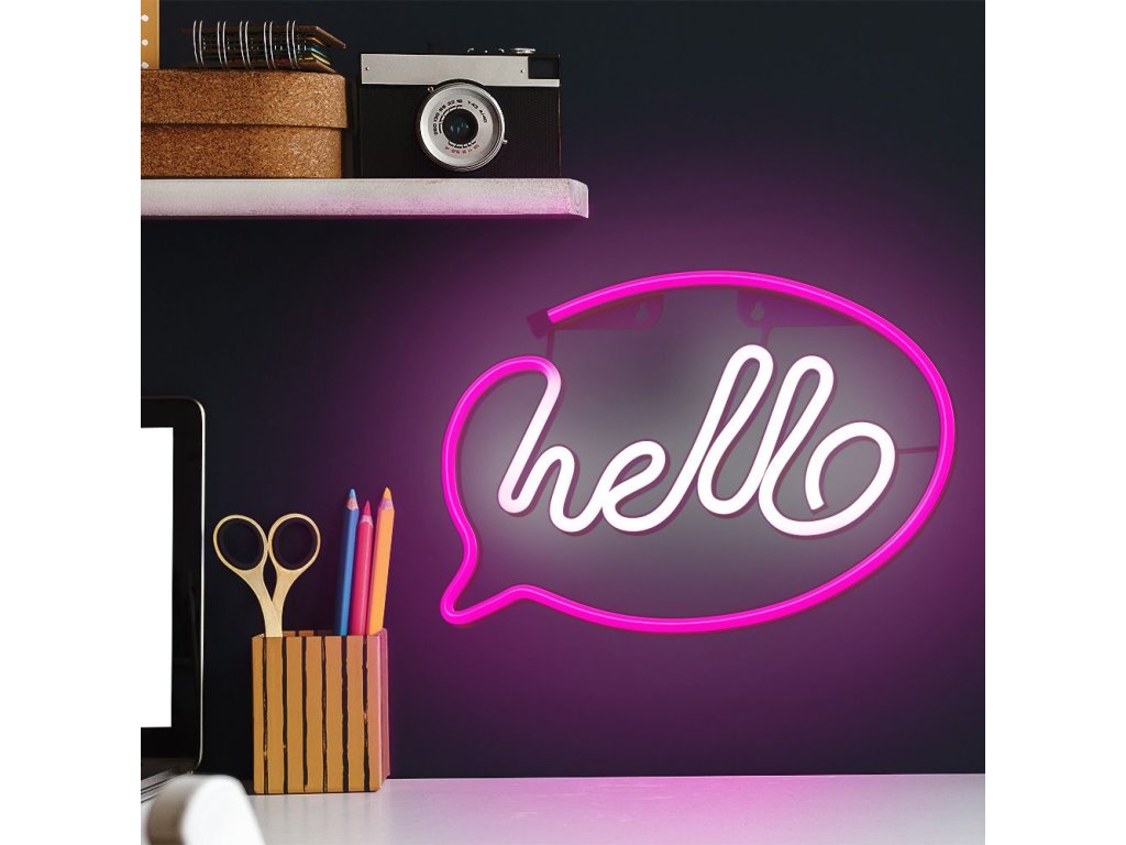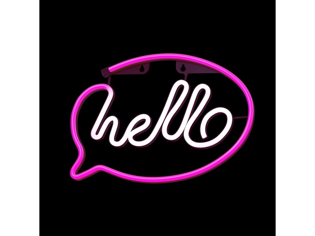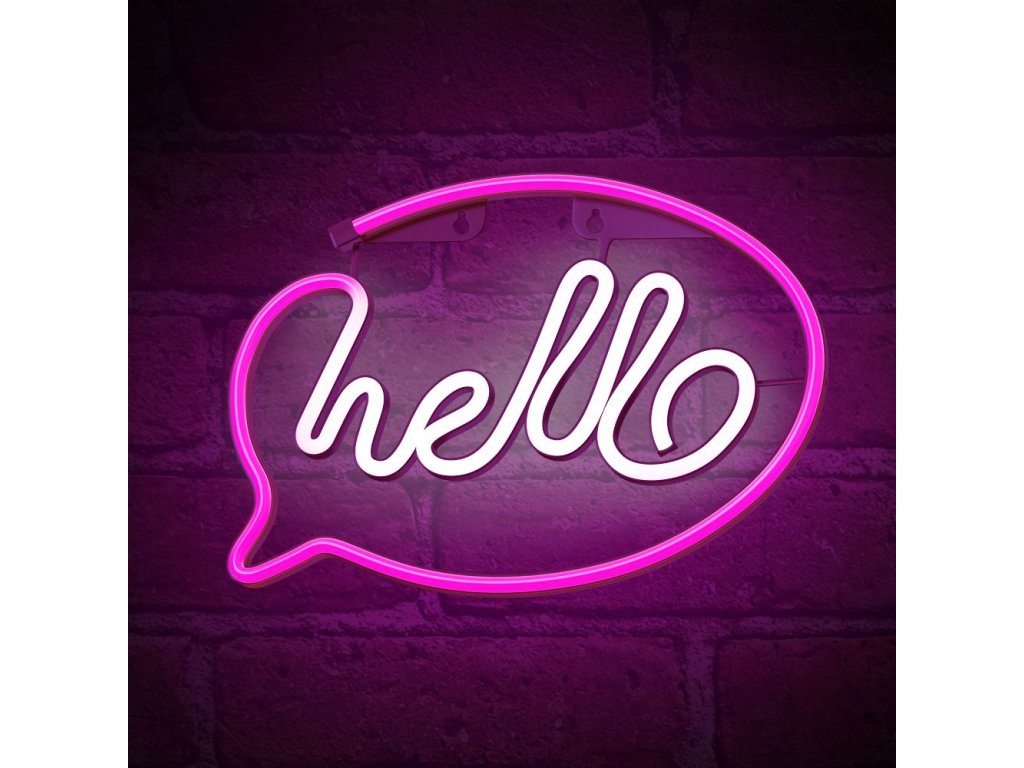 Svetelný nápis Hello je vyrobený z LED imitácie neónu. Svetelná dekorácia ktorá vytvorí vašim hosťom úsmev na tvári, rozjasní každú miestnosť farebným svetlom. Nádherný rozptyl svetla bez viditeľných svetelných bodov. Vďaka pevnému PVC rámu je bezpečne chránený a zároveň jednoducho inštalovateľný na stenu pomocou neviditeľných dier. Vďaka technológii postavenej na LED diódach, sú tieto neóny oveľa spoľahlivejšie a navyše oveľa úspornejšie, ako klasické neóny.