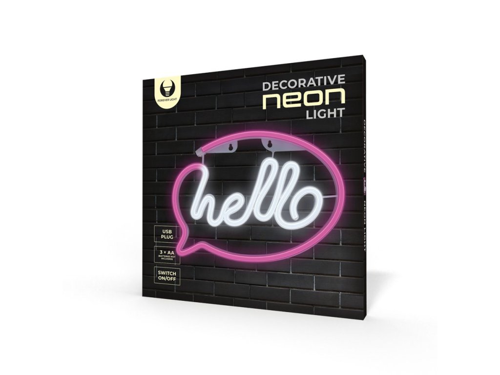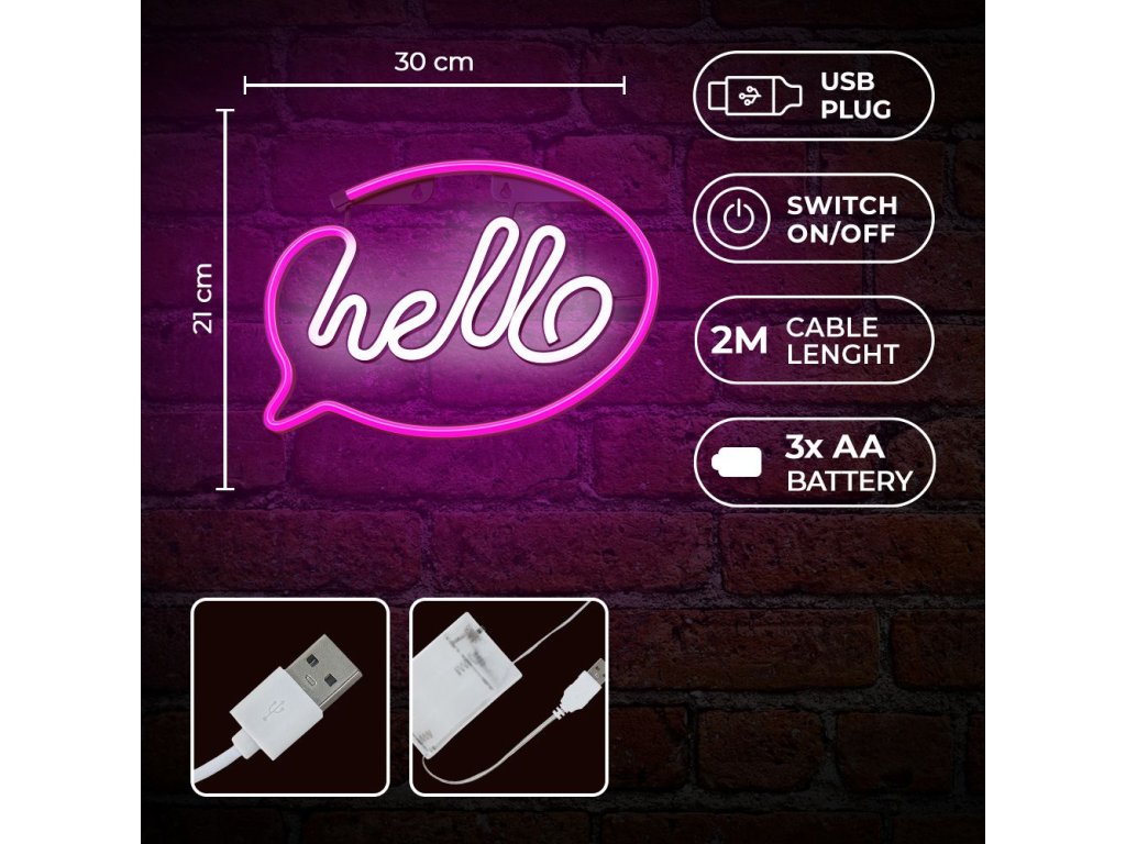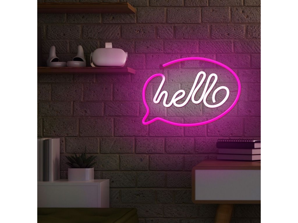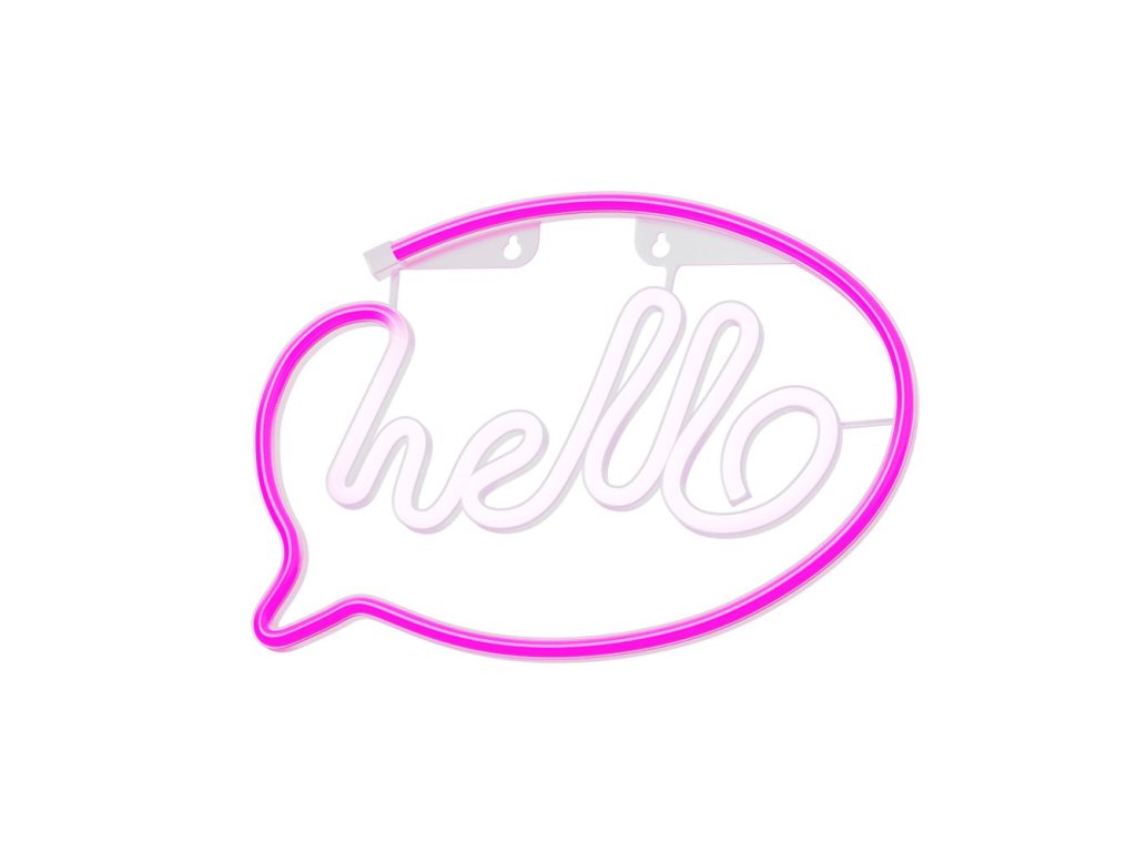 Svetelný nápis Hello je vyrobený z LED imitácie neónu. Svetelná dekorácia ktorá vytvorí vašim hosťom úsmev na tvári, rozjasní každú miestnosť farebným svetlom. Nádherný rozptyl svetla bez viditeľných svetelných bodov. Vďaka pevnému PVC rámu je bezpečne chránený a zároveň jednoducho inštalovateľný na stenu pomocou neviditeľných dier. Vďaka technológii postavenej na LED diódach, sú tieto neóny oveľa spoľahlivejšie a navyše oveľa úspornejšie, ako klasické neóny.