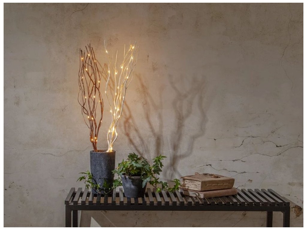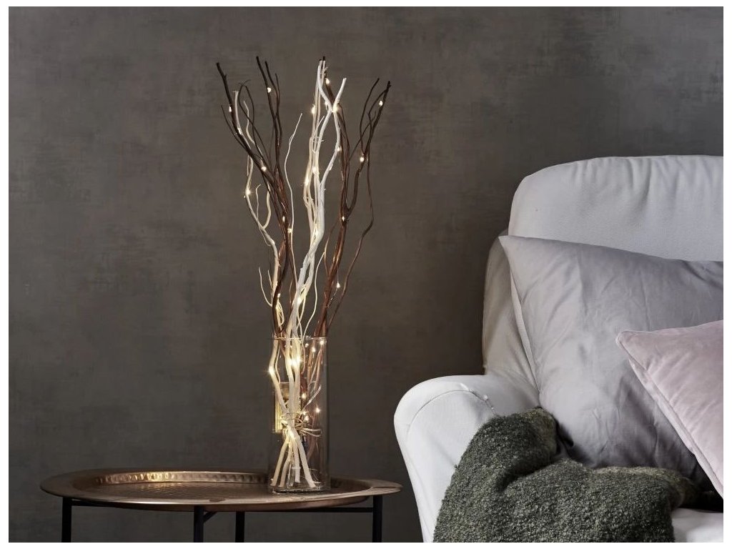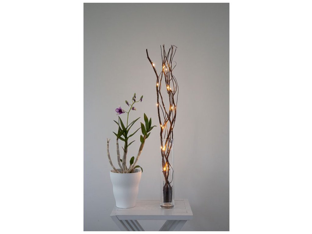 Hnedá 60cm vysoká drevená vetvička pripomína vŕbové prútie a je dozdobená 24 LED svetielkami na tenučkom priesvitnom kábli. Krásna interiérová dekorácia, ktorá dodá vašej izbe útulné svetlo