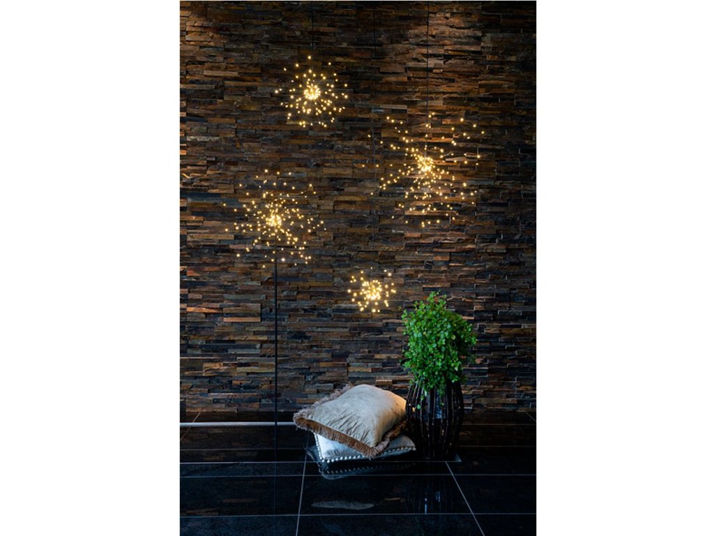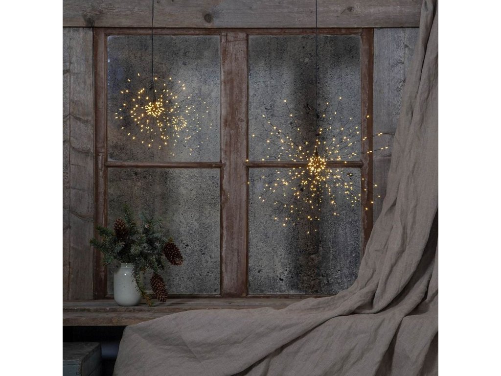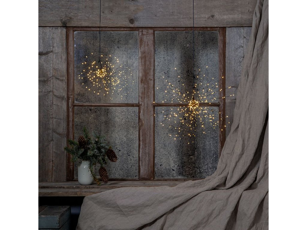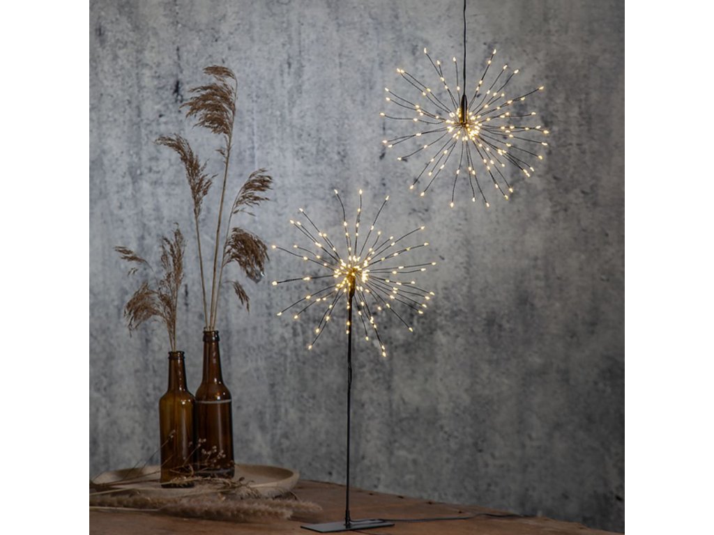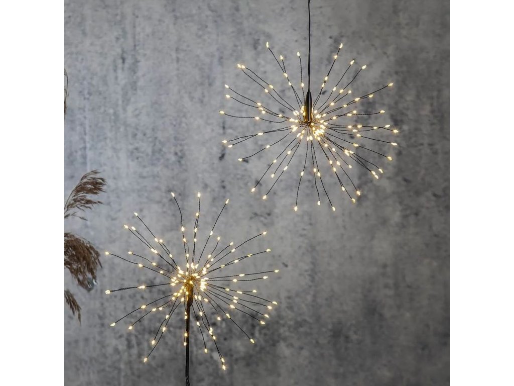 Vianočné osvetlenie v tvare ohňostroja, alebo prskavky jednoducho zavesíte na požadované miesto, napríklad do okna, alebo len tak okolo vianočného stromčeka. Táto 3D dekorácie je vybavená miniatúrnymi LED v príjemnej hrejivej teplej farbe. Pútavá dekorácia vhodná na výzdobu interiéru domácnosti alebo komerčnej prevádzky. Nízka spotreba energie a dlhá životnosť LED.